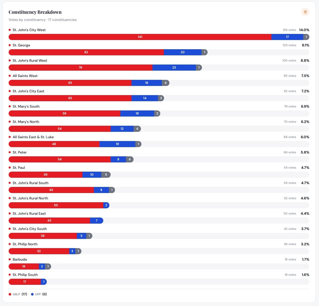 The survey further revealed that the Antigua and Barbuda Labour Party is leading in all 17 constituencies. Among the strongest performing areas for the party were St. John’s City West, where the party secured 141 votes compared to UPP’s 17; St. George, with 82 votes for ABLP against 20 for UPP; St. John’s Rural West and All Saints West, both showing decisive leads for ABLP.